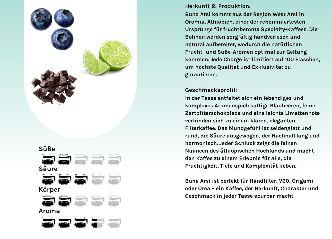 Seine seidige Textur, die klare Süße und die präzise Fruchtigkeit machen Buna Arsi zu einem ausdrucksstarken Filterkaffee mit langem, komplexem Nachgeschmack. Gleichzeitig bleibt er angenehm zugänglich und sorgt für eine hohe Trinkfreude – sowohl für Specialty-Nerds als auch für neugierige Entdecker.