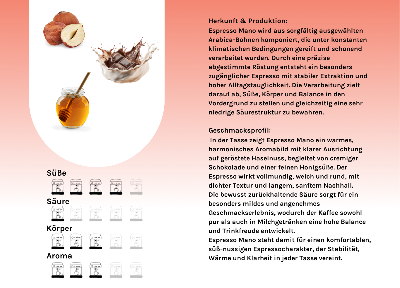 Espresso Mano ist ein besonders zugänglicher Espresso für alle, die einen weichen, harmonischen und süßen Kaffee suchen. Im Vordergrund stehen warme Haselnussnoten, begleitet von zarter Schokolade und einer feinen Honigsüße, die dem Espresso eine angenehme Tiefe und Balance verleiht.