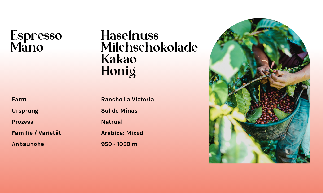 Dank seiner einfachen Struktur lässt sich Espresso Mano unkompliziert extrahieren und verzeiht kleine Anpassungen beim Mahlgrad oder in der Zubereitung. Dadurch funktioniert er zuverlässig im Siebträger, im Vollautomaten oder in Kombination mit Milch – ohne an Charakter zu verlieren.