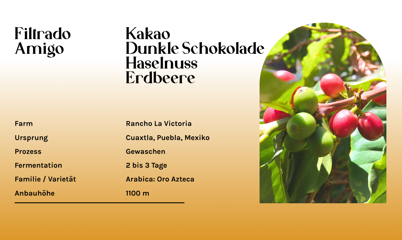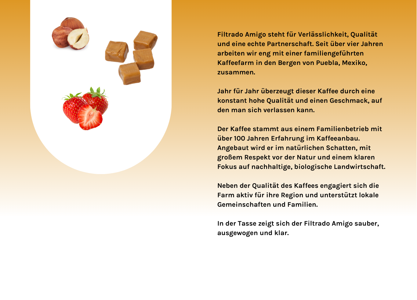 Der Filtrado Amigo ist der unverwechselbarer (Freund) Filterkaffee im Alltag. Dieser hell geröster Kaffee stammt von der Finca Rancho La Victoria in Puebla, Mexiko, wo seit vier Generationen nachhaltiger Bio-Kaffee im natürlichen Schatten angebaut wird.